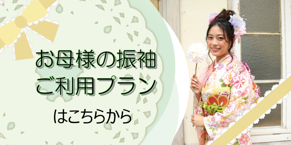 ママ振袖を活用するなら早めの準備が必要です。はやのやでは、「ママ振袖活用プラン」をご用意しています。ママ振袖のクリーニングやサイズ直し、小物の準備やコーディネートをご提案させていただきます。お気軽にお問い合わせください。
