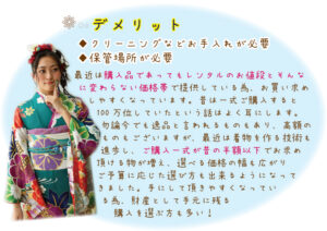 成人式の時一度だけ着られればいいのか、お気に入りの振袖を何度も着たいのかのどちらかでしょう。何度も着る機会がありそうなら購入を考えてみるのもいいと思います。