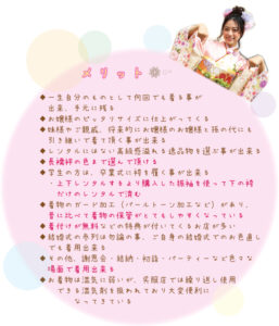 ※ご家族のご意見やお嬢様のご意見など話し合ったり、呉服店に行かれて着物のプロのアドバイスを参考にしながら、ご自身が満足できる振袖を選んでみて下さい。