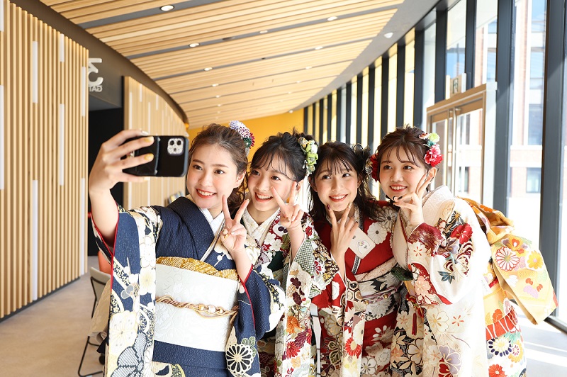 写真撮影をするときは左側を少し前にして、斜めに立つと綺麗な立ち姿になります。自分らしくアレンジした帯結びをしたら写真に残しておきましょう。袖を広げて全体の柄を見せたり、20歳のポーズをしたり、さまざまな角度で撮影しておくと良い思い出として残ります。