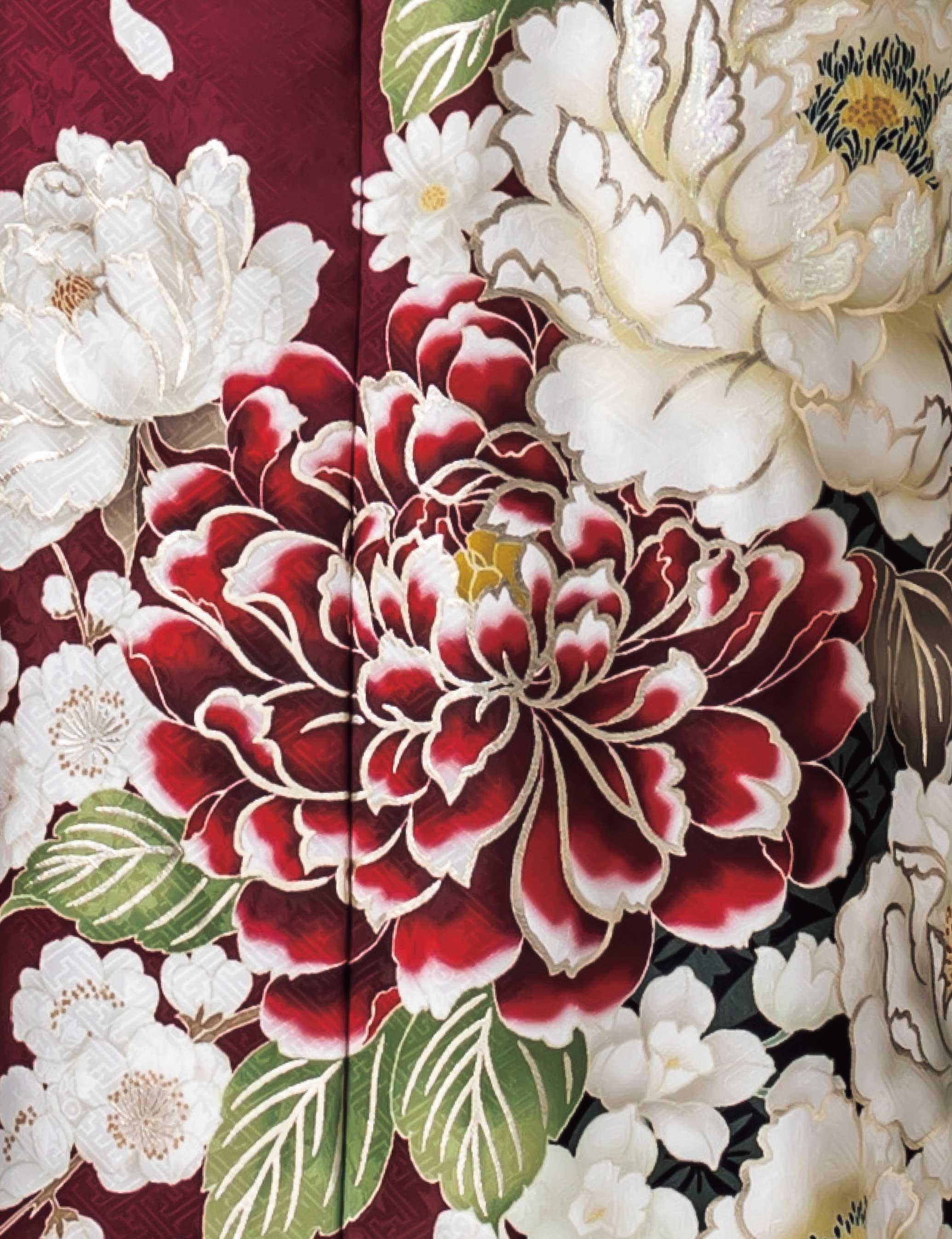 えんじと黒の地に咲く白紅の牡丹が、華やかさと品格を併せ持つ振袖。幾何文様がモダンな印象を添え、青の帯締が凛とした存在感を引き立てる、力強く美しい晴れ姿に。
