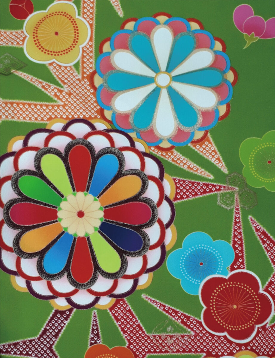 鮮やかな黄緑色のきものに古典的な柄を可愛く表現。